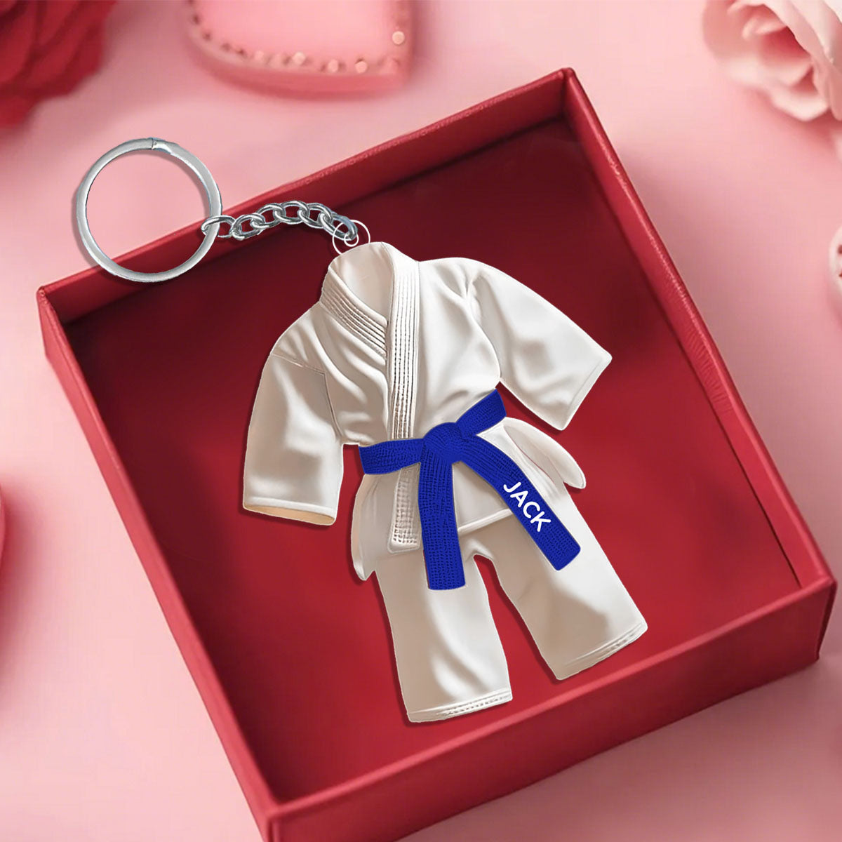 This Jiu Jitsu black belt keychain is custom engraved with a name or rank—honoring the discipline, strength, and heart earned on the mat.