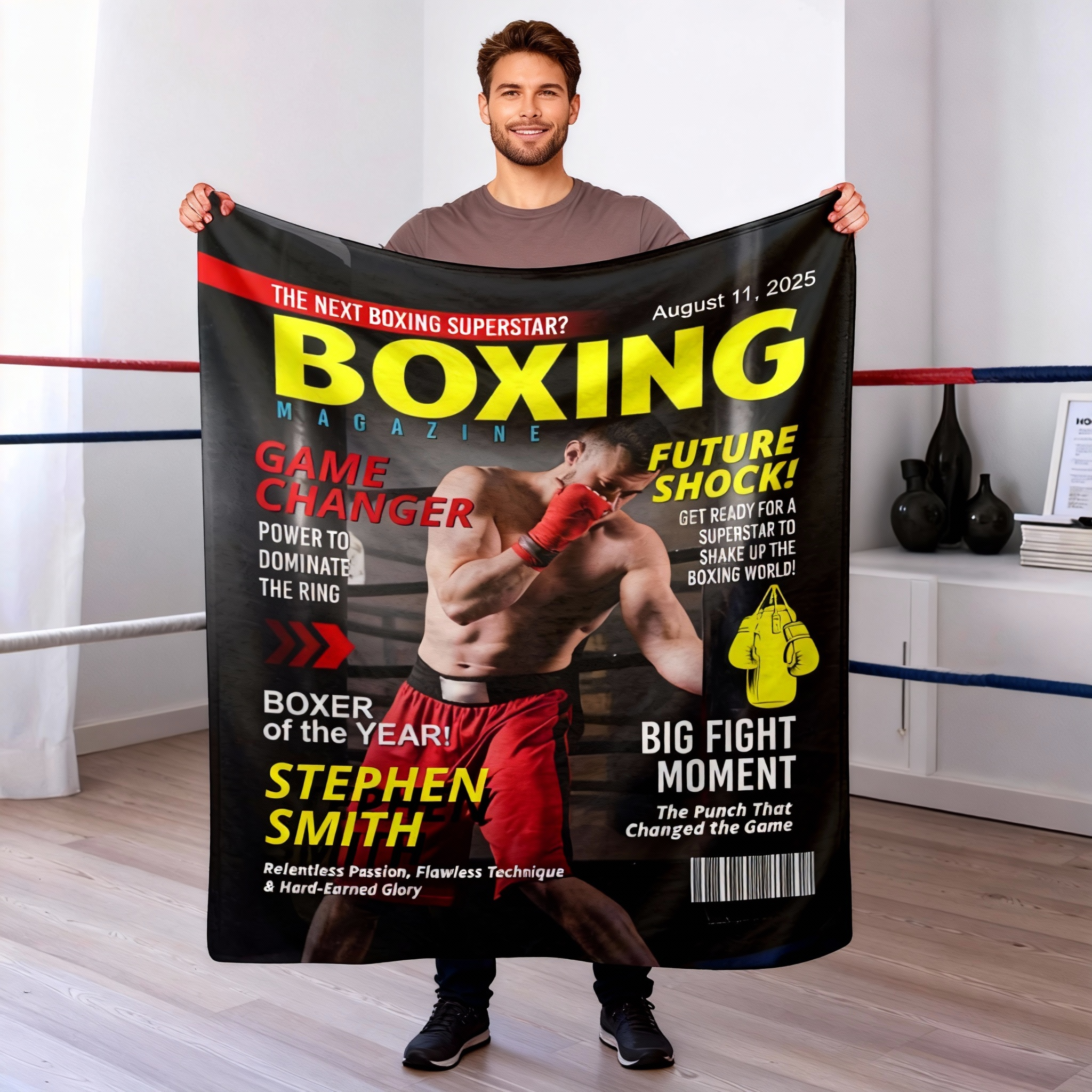 The perfect gift tailored for boxing enthusiasts. This personalized magazine cover blanket immortalizes their MVP moments, showcasing their glorious achievements in their boxing career. 🥊