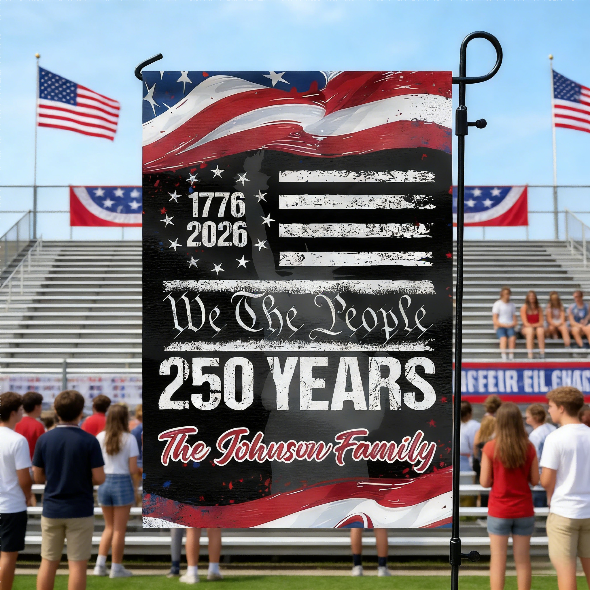 Mark the monumental U.S. Semiquincentennial (1776–2026) with this Personalized Garden Flag—a bold and patriotic tribute to 250 years of freedom, history, and family pride. Featuring stars and stripes, and the milestone dates, this custom garden flag lets you add your family name, making it a unique heirloom for your home.